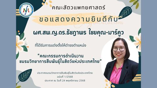 ขอแสดงความยินดีกับ ผศ.สพ.ญ.ดร.ธัชฎาพร ไชยคุณ-มาร์คูว ที่ได้รับการแต่งตั้งให้ดำรงตำแหน่ง "คณะกรรมการดำเนินงานชมรมวิทยาการสืบพันธุ์สัตว์แห่งประเทศไทย"