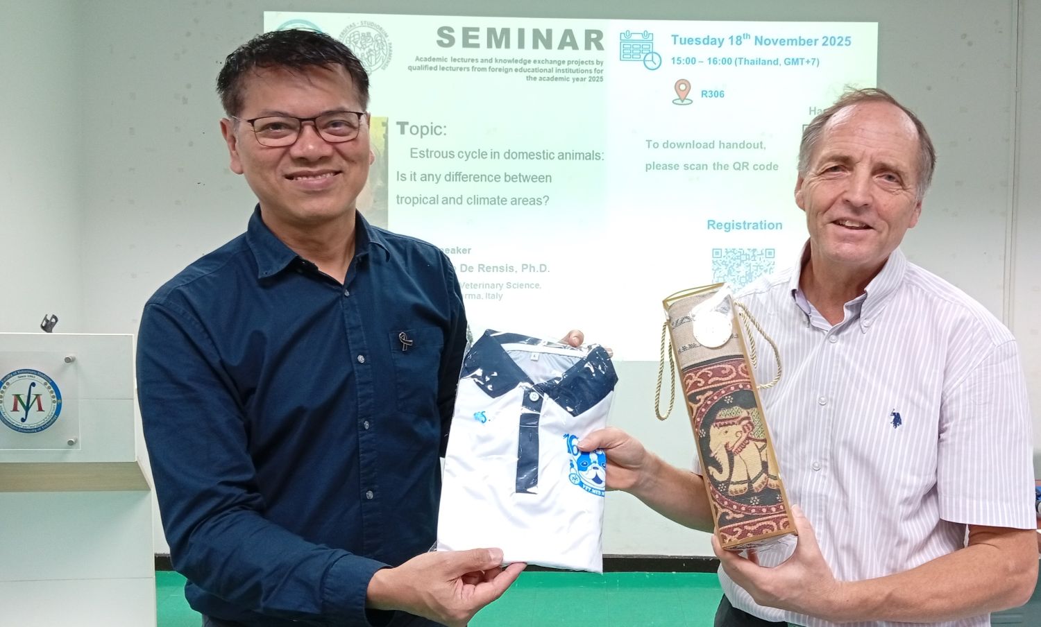 วันอังคารที่ 18 พฤศจิกายน 2568 Prof. Fabio De Rensis, PhD จาก Department of Veterinary Science จาก University of Parma สาธารณรัฐอิตาลี ได้ให้เกียรติมาเป็นผู้บรรยาย เรื่อง “Estrous cycle in domestic animals: Is it any difference between tropical and climate areas?” ในโครงการบรรยายทางวิชาการและแลกเปลี่ยนเรียนรู้ ครั้งที่ 6 ประจำปีการศึกษา 2568 ณ คณะสัตวแพทยศาสตร์ มหาวิทยาลัยเทคโนโลยีมหานคร จัดโดยฝ่ายวิเทศสัมพันธ์และความร่วมมือองค์กร คณะสัตวแพทยศาสตร์ มหาวิทยาลัยเทคโนโลยีมหานคร