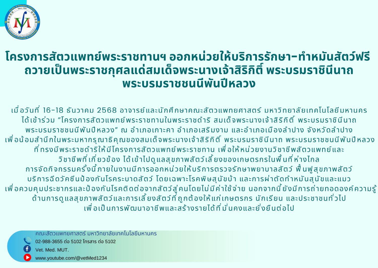 ประมวลภาพโครงการสัตวแพทย์พระราชทานในพระราชดำริ สมเด็จพระนางเจ้าสิริกิติ์ พระบรมราชินีนาถ พระบรมราชชนนีพันปีหลวง ประจำปี พ.ศ.2568 ณ จังหวัดลำปาง วันที่ 16-18 ธันวาคม 2568