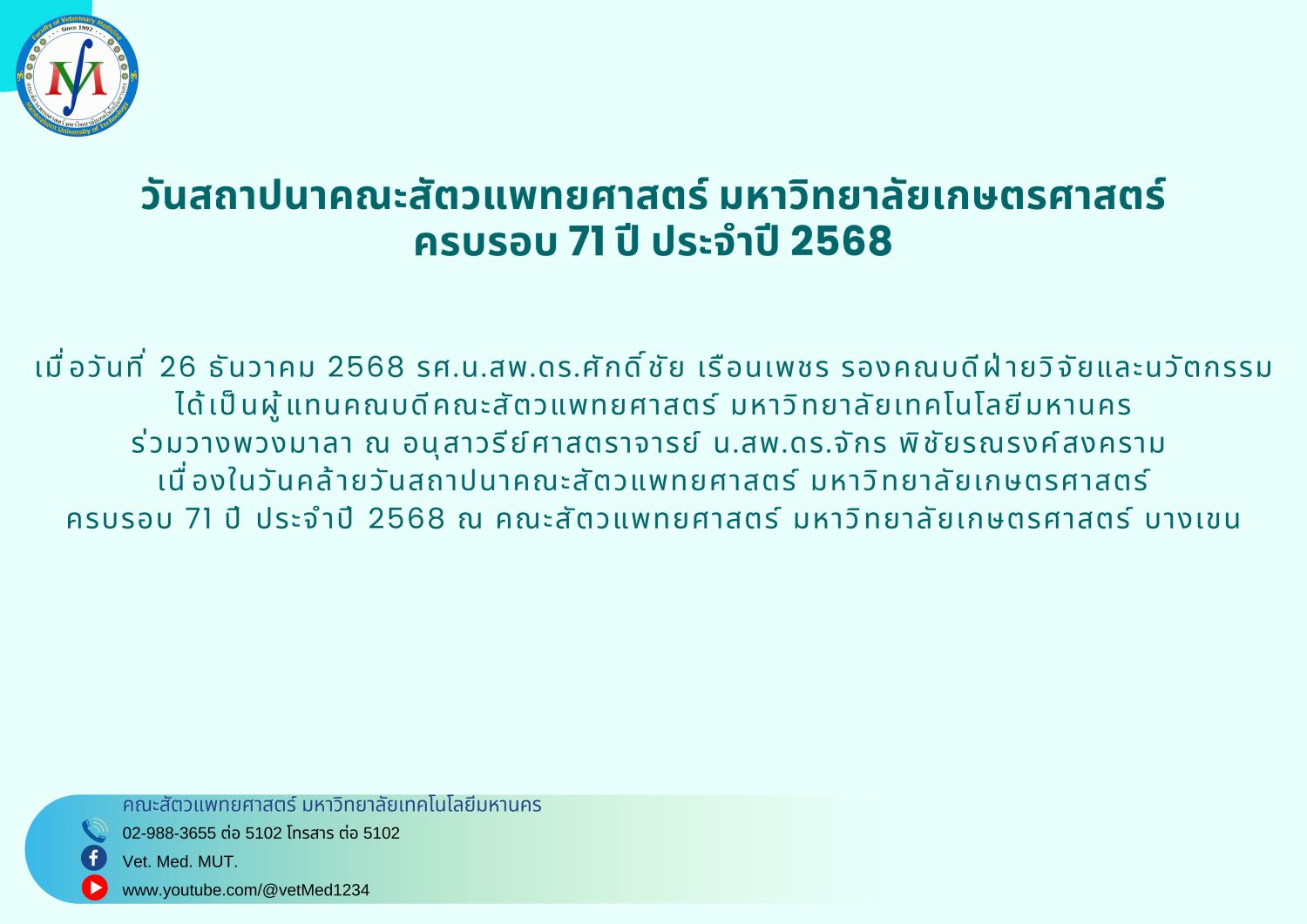 ร่วมงานวันคล้ายวันสถาปนาคณะสัตวแพทยศาสตร์ มหาวิทยาลัยเกษตรศาสตร์ ครบรอบ 71 ปี ประจำปี 2568