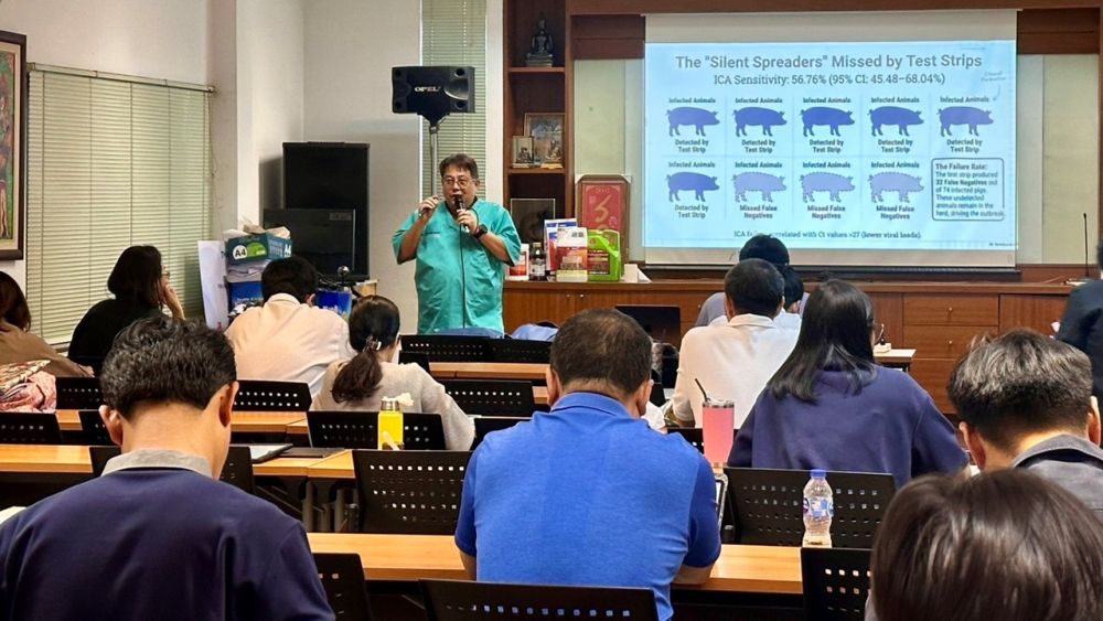 เมื่อวันจันทร์ที่ 2 กุมภาพันธ์ 2569 รองศาสตราจารย์ นายสัตวแพทย์ ดร.ศักดิ์ชัย เรือนเพชร รองคณบดีฝ่ายวิจัยและนวัตกรรม ได้รับเกียรติเชิญเป็นวิทยากรบรรยายในหัวข้อเรื่อง “Update Diagnostic Techniques for African Swine Fever in the Field” เพื่อถ่ายทอดองค์ความรู้และเทคโนโลยีการวินิจฉัยโรคอหิวาต์แอฟริกาในสุกรให้แก่นายสัตวแพทย์ผู้สนใจ ณ บริษัท เวท อะกริเทค จำกัด สำนักงานใหญ่ จังหวัดนนทบุรี