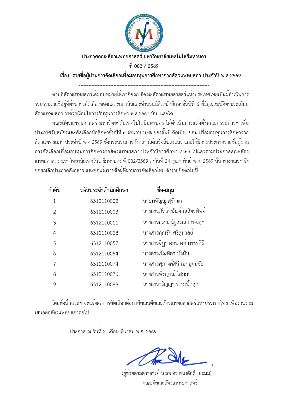 ประกาศคณะสัตวแพทยศาสตร์ มหาวิทยาลัยเทคโนโลยีมหานคร ที่ 003/2569 เรื่อง รายชื่อผู้ผ่านการคัดเลือกเพื่อมอบทุนการศึกษาจากสัตวแพทยสภา ประจำปี พ.ศ.2569