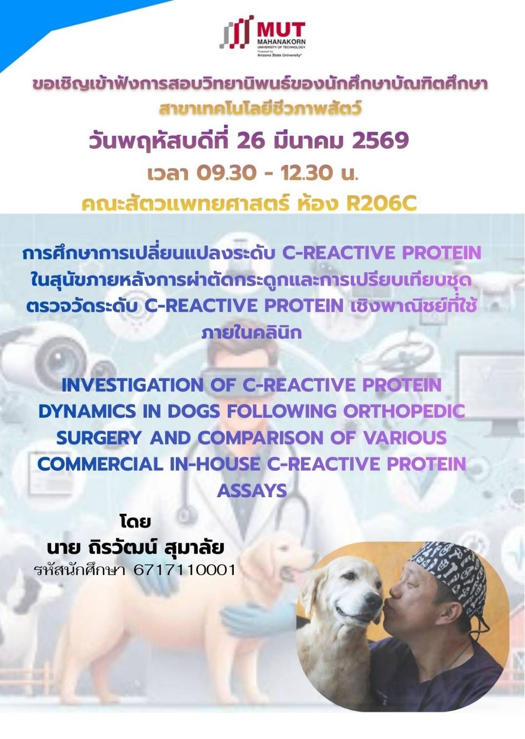 ขอเชิญเข้าฟังการสอบวิทยานิพนธ์ของนักศึกษาบัณฑิตศึกษา สาขาเทคโนโลยีชีวภาพสัตว์ วันที่ 26 มีนาคม 2569